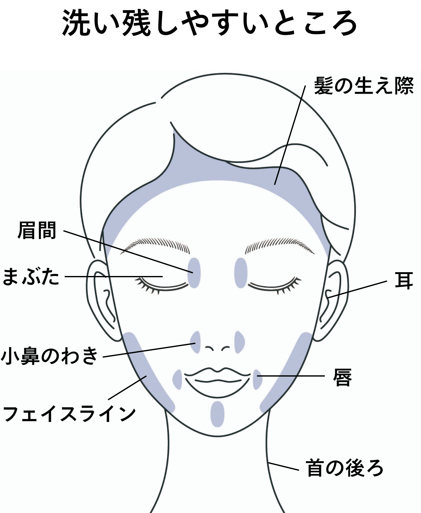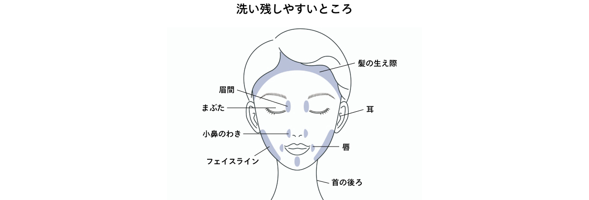額や鼻など脂っぽい部分は指の腹を使って丁寧に。ゴシゴシこするのは禁物。
