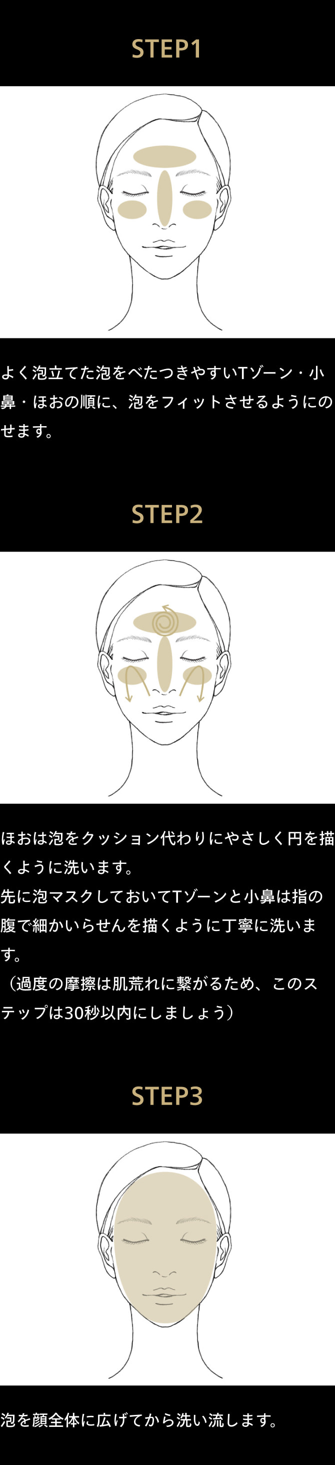 たっぷりの泡で顔を包み込み、肌の上で転がすように顔全体を優しく洗う。
