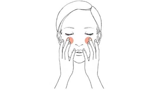 中指で眉頭の下のくぼみを押し、(3秒)その後、3本指で目の下の骨に沿って目頭からこめかみに向かって引き上げます。(6回)