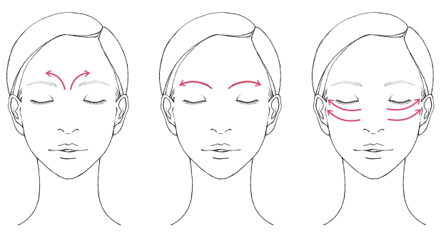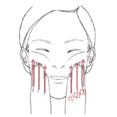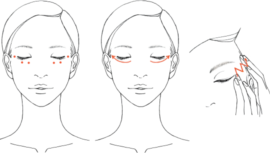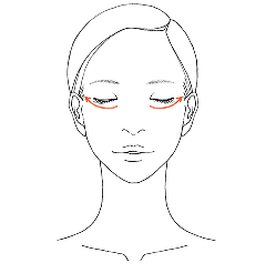 ・眉間は斜め上にすり上げます。(各6回)・眉頭の下のくぼみから骨に沿ってすべらせます。(各6回)・目の下の骨に沿って目頭からこめかみまで引き上げるようにすべらせます。 (各6回)