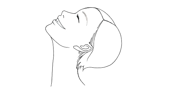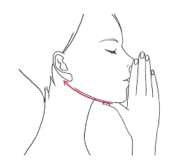左側面を右手の4本指全体で、首から顔の側面を通りこめかみまで、下から上に向かって引き上げたまま、左手の4本指をあごにおき、下に引きながら顔の側面をのばしキープします。(約3秒)右側面は手を変えて同様に行います。(左右各3回)
