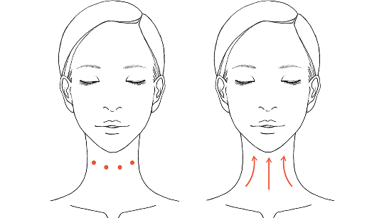 ・軽くあごをあげて、首のしわを伸ばすようにし て、気になるしわに置き、広げます。・右手で左側、左手で右側の首に、下から上へやさしくなじませます。