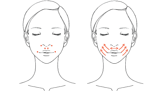 ・口角まわり、口もとの気になるしわに置き、広げます。・両手の中指と薬指の腹を使い、横に伸ばすようにして、やさしくなじませます。
