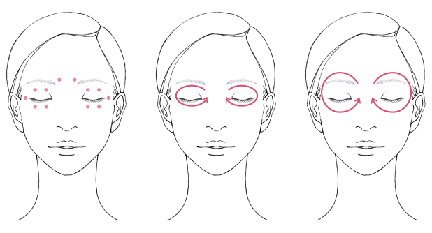 ・クリームを目の下、目尻、まぶた、眉間に置きます。(各6カ所)・目のまわりを囲むように広げます。(3回)・眉間から目の下を囲むように広げます。