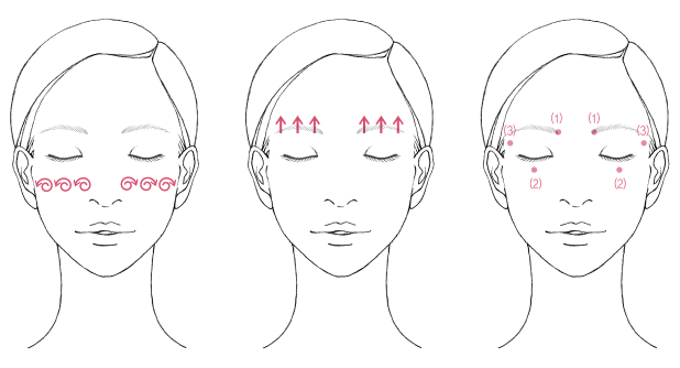 ・目の下の骨から指1本分下の部分をクルクルともみほぐした後押します。(3カ所を1回として3回)・眉の下から上に向かって持ち上げます。(3カ所を1回として3回)・目まわりに効果的なポイント(①②③)を押します。